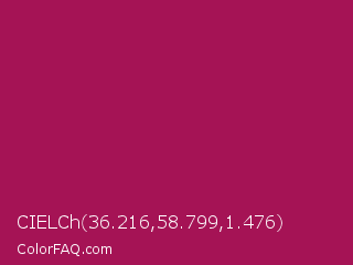 CIELCh 36.216,58.799,1.476 Color is a normal rose color and the nearest color is Jazzberry Jam #a50b5e. Hex code #a51355 and RGB value is rgb(165,19,85). In RGB color space, this color is composed of 65% red, 7% green, 33% blue, In CMYK color space, this color is composed of 0% cyan, 88% magenta, 48% yellow , 35% black , In HSL color space, this color has a hue angle of 333° , 79% saturation and 36% lightness.