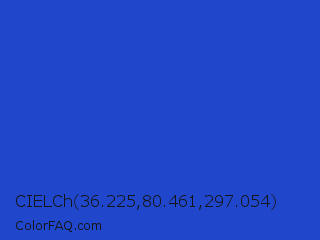 CIELCh 36.225,80.461,297.054 Color is a normal blue color and the nearest color is New Car #214fc6. Hex code #2047cb and RGB value is rgb(32,71,203). In RGB color space, this color is composed of 13% red, 28% green, 80% blue, In CMYK color space, this color is composed of 84% cyan, 65% magenta, 0% yellow , 20% black , In HSL color space, this color has a hue angle of 226° , 73% saturation and 46% lightness.