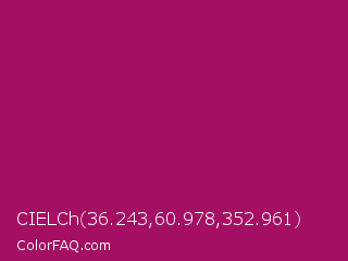 CIELCh 36.243,60.978,352.961 Color is a normal magenta color and the nearest color is Jazzberry Jam #a50b5e. Hex code #a40f63 and RGB value is rgb(164,15,99). In RGB color space, this color is composed of 64% red, 6% green, 39% blue, In CMYK color space, this color is composed of 0% cyan, 91% magenta, 40% yellow , 36% black , In HSL color space, this color has a hue angle of 326° , 83% saturation and 35% lightness.