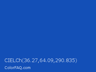 CIELCh 36.27,64.09,290.835 Color is a normal blue color and the nearest color is Sapphire #0f52ba. Hex code #134fb7 and RGB value is rgb(19,79,183). In RGB color space, this color is composed of 7% red, 31% green, 72% blue, In CMYK color space, this color is composed of 90% cyan, 57% magenta, 0% yellow , 28% black , In HSL color space, this color has a hue angle of 218° , 81% saturation and 40% lightness.