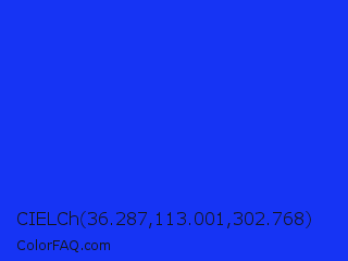 CIELCh 36.287,113.001,302.768 Color is a normal blue color and the nearest color is Bluebonnet #1c1cf0. Hex code #1634f4 and RGB value is rgb(22,52,244). In RGB color space, this color is composed of 9% red, 20% green, 96% blue, In CMYK color space, this color is composed of 91% cyan, 79% magenta, 0% yellow , 4% black , In HSL color space, this color has a hue angle of 232° , 91% saturation and 52% lightness.