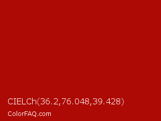 CIELCh 36.2,76.048,39.428 Color is a normal red color and the nearest color is Mordant Red 19 #ae0c00. Hex code #ad0a05 and RGB value is rgb(173,10,5). In RGB color space, this color is composed of 68% red, 4% green, 2% blue, In CMYK color space, this color is composed of 0% cyan, 94% magenta, 97% yellow , 32% black , In HSL color space, this color has a hue angle of 2° , 94% saturation and 35% lightness.