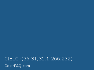 CIELCh 36.31,31.1,266.232 Color is a normal blue color and the nearest color is Blumine #18587a. Hex code #1e5987 and RGB value is rgb(30,89,135). In RGB color space, this color is composed of 12% red, 35% green, 53% blue, In CMYK color space, this color is composed of 78% cyan, 34% magenta, 0% yellow , 47% black , In HSL color space, this color has a hue angle of 206° , 64% saturation and 32% lightness.