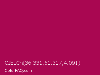 CIELCh 36.331,61.317,4.091 Color is a normal rose color and the nearest color is Jazzberry Jam #a50b5e. Hex code #a90751 and RGB value is rgb(169,7,81). In RGB color space, this color is composed of 66% red, 3% green, 32% blue, In CMYK color space, this color is composed of 0% cyan, 96% magenta, 52% yellow , 34% black , In HSL color space, this color has a hue angle of 333° , 92% saturation and 35% lightness.