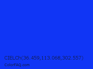 CIELCh 36.459,113.068,302.557 Color is a normal blue color and the nearest color is Blue RYB #0247fe. Hex code #1035f5 and RGB value is rgb(16,53,245). In RGB color space, this color is composed of 6% red, 21% green, 96% blue, In CMYK color space, this color is composed of 93% cyan, 78% magenta, 0% yellow , 4% black , In HSL color space, this color has a hue angle of 230° , 92% saturation and 51% lightness.