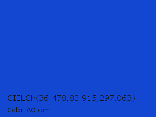 CIELCh 36.478,83.915,297.063 Color is a normal blue color and the nearest color is New Car #214fc6. Hex code #1447d1 and RGB value is rgb(20,71,209). In RGB color space, this color is composed of 8% red, 28% green, 82% blue, In CMYK color space, this color is composed of 90% cyan, 66% magenta, 0% yellow , 18% black , In HSL color space, this color has a hue angle of 224° , 83% saturation and 45% lightness.