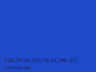 CIELCh 36.566,78.64,296.27 Color is a normal blue color and the nearest color is New Car #214fc6. Hex code #1e49ca and RGB value is rgb(30,73,202). In RGB color space, this color is composed of 12% red, 29% green, 79% blue, In CMYK color space, this color is composed of 85% cyan, 64% magenta, 0% yellow , 21% black , In HSL color space, this color has a hue angle of 225° , 74% saturation and 45% lightness.