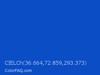 CIELCh 36.664,72.859,293.373 Color is a normal blue color and the nearest color is Sapphire #0f52ba. Hex code #0a4dc4 and RGB value is rgb(10,77,196). In RGB color space, this color is composed of 4% red, 30% green, 77% blue, In CMYK color space, this color is composed of 95% cyan, 61% magenta, 0% yellow , 23% black , In HSL color space, this color has a hue angle of 218° , 90% saturation and 40% lightness.