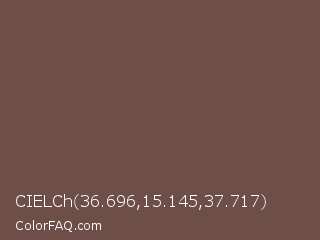 CIELCh 36.696,15.145,37.717 Color is a normal red color and the nearest color is Medium Taupe #674c47. Hex code #6e4f48 and RGB value is rgb(110,79,72). In RGB color space, this color is composed of 43% red, 31% green, 28% blue, In CMYK color space, this color is composed of 0% cyan, 28% magenta, 35% yellow , 57% black , In HSL color space, this color has a hue angle of 11° , 21% saturation and 36% lightness.