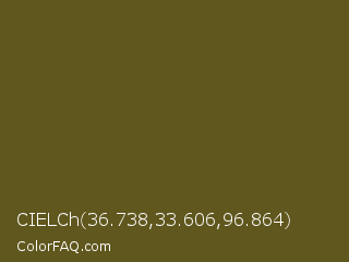 CIELCh 36.738,33.606,96.864 Color is a dark yellow color and the nearest color is West Coast #625119. Hex code #60571e and RGB value is rgb(96,87,30). In RGB color space, this color is composed of 38% red, 34% green, 12% blue, In CMYK color space, this color is composed of 0% cyan, 9% magenta, 69% yellow , 62% black , In HSL color space, this color has a hue angle of 52° , 52% saturation and 25% lightness.