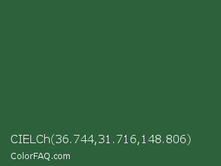 CIELCh 36.744,31.716,148.806 Color is a dark green color and the nearest color is Hunter Green #355e3b. Hex code #2c613b and RGB value is rgb(44,97,59). In RGB color space, this color is composed of 17% red, 38% green, 23% blue, In CMYK color space, this color is composed of 55% cyan, 0% magenta, 39% yellow , 62% black , In HSL color space, this color has a hue angle of 137° , 38% saturation and 28% lightness.