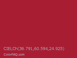 CIELCh 36.791,60.594,24.925 Color is a normal red color and the nearest color is Vivid Burgundy #9f1d35. Hex code #a81d31 and RGB value is rgb(168,29,49). In RGB color space, this color is composed of 66% red, 11% green, 19% blue, In CMYK color space, this color is composed of 0% cyan, 83% magenta, 71% yellow , 34% black , In HSL color space, this color has a hue angle of 351° , 71% saturation and 39% lightness.