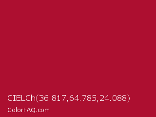 CIELCh 36.817,64.785,24.088 Color is a normal red color and the nearest color is Shiraz #b20931. Hex code #ad0f30 and RGB value is rgb(173,15,48). In RGB color space, this color is composed of 68% red, 6% green, 19% blue, In CMYK color space, this color is composed of 0% cyan, 91% magenta, 72% yellow , 32% black , In HSL color space, this color has a hue angle of 347° , 84% saturation and 37% lightness.