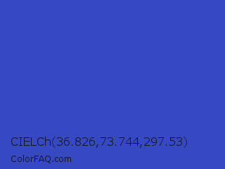 CIELCh 36.826,73.744,297.53 Color is a normal blue color and the nearest color is Cerulean Blue #2a52be. Hex code #3649c2 and RGB value is rgb(54,73,194). In RGB color space, this color is composed of 21% red, 29% green, 76% blue, In CMYK color space, this color is composed of 72% cyan, 62% magenta, 0% yellow , 24% black , In HSL color space, this color has a hue angle of 232° , 56% saturation and 49% lightness.