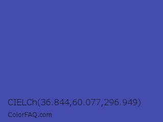 CIELCh 36.844,60.077,296.949 Color is a normal blue color and the nearest color is Ocean Blue #4f42b5. Hex code #444cae and RGB value is rgb(68,76,174). In RGB color space, this color is composed of 27% red, 30% green, 68% blue, In CMYK color space, this color is composed of 61% cyan, 56% magenta, 0% yellow , 32% black , In HSL color space, this color has a hue angle of 235° , 44% saturation and 47% lightness.