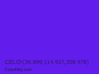 CIELCh 36.899,114.927,308.978 Color is a normal indigo color and the nearest color is Han Purple #5218fa. Hex code #621cec and RGB value is rgb(98,28,236). In RGB color space, this color is composed of 38% red, 11% green, 93% blue, In CMYK color space, this color is composed of 58% cyan, 88% magenta, 0% yellow , 7% black , In HSL color space, this color has a hue angle of 260° , 85% saturation and 52% lightness.