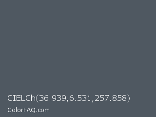 CIELCh 36.939,6.531,257.858 Color is a normal blue color and the nearest color is Scarpa Flow #585562. Hex code #4f5861 and RGB value is rgb(79,88,97). In RGB color space, this color is composed of 31% red, 35% green, 38% blue, In CMYK color space, this color is composed of 19% cyan, 9% magenta, 0% yellow , 62% black , In HSL color space, this color has a hue angle of 210° , 10% saturation and 35% lightness.