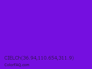 CIELCh 36.94,110.654,311.9 Color is a normal violet color and the nearest color is French Violet #8806ce. Hex code #750fe0 and RGB value is rgb(117,15,224). In RGB color space, this color is composed of 46% red, 6% green, 88% blue, In CMYK color space, this color is composed of 48% cyan, 93% magenta, 0% yellow , 12% black , In HSL color space, this color has a hue angle of 269° , 87% saturation and 47% lightness.