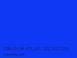 CIELCh 36.971,111.522,302.122 Color is a normal blue color and the nearest color is Blue RYB #0247fe. Hex code #0f38f5 and RGB value is rgb(15,56,245). In RGB color space, this color is composed of 6% red, 22% green, 96% blue, In CMYK color space, this color is composed of 94% cyan, 77% magenta, 0% yellow , 4% black , In HSL color space, this color has a hue angle of 229° , 92% saturation and 51% lightness.