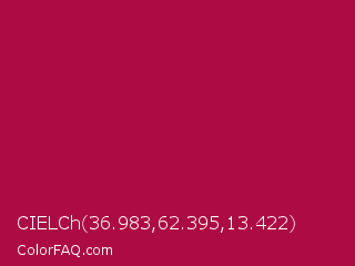 CIELCh 36.983,62.395,13.422 Color is a normal rose color and the nearest color is Shiraz #b20931. Hex code #ad0b43 and RGB value is rgb(173,11,67). In RGB color space, this color is composed of 68% red, 4% green, 26% blue, In CMYK color space, this color is composed of 0% cyan, 94% magenta, 61% yellow , 32% black , In HSL color space, this color has a hue angle of 339° , 88% saturation and 36% lightness.