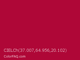 CIELCh 37.007,64.956,20.102 Color is a normal rose color and the nearest color is Shiraz #b20931. Hex code #af0737 and RGB value is rgb(175,7,55). In RGB color space, this color is composed of 69% red, 3% green, 22% blue, In CMYK color space, this color is composed of 0% cyan, 96% magenta, 69% yellow , 31% black , In HSL color space, this color has a hue angle of 343° , 92% saturation and 36% lightness.