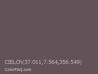 CIELCh 37.011,7.564,356.549 Color is a normal rose color and the nearest color is Zambezi #685558. Hex code #635358 and RGB value is rgb(99,83,88). In RGB color space, this color is composed of 39% red, 33% green, 35% blue, In CMYK color space, this color is composed of 0% cyan, 16% magenta, 11% yellow , 61% black , In HSL color space, this color has a hue angle of 341° , 9% saturation and 36% lightness.