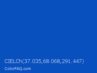 CIELCh 37.035,68.068,291.447 Color is a normal blue color and the nearest color is Sapphire #0f52ba. Hex code #0950bf and RGB value is rgb(9,80,191). In RGB color space, this color is composed of 4% red, 31% green, 75% blue, In CMYK color space, this color is composed of 95% cyan, 58% magenta, 0% yellow , 25% black , In HSL color space, this color has a hue angle of 217° , 91% saturation and 39% lightness.