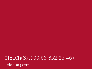 CIELCh 37.109,65.352,25.46 Color is a normal red color and the nearest color is Shiraz #b20931. Hex code #ae112e and RGB value is rgb(174,17,46). In RGB color space, this color is composed of 68% red, 7% green, 18% blue, In CMYK color space, this color is composed of 0% cyan, 90% magenta, 74% yellow , 32% black , In HSL color space, this color has a hue angle of 349° , 82% saturation and 37% lightness.