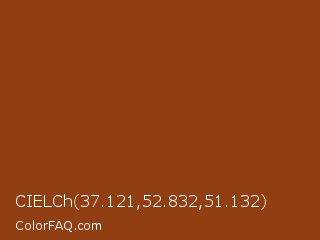 CIELCh 37.121,52.832,51.132 Color is a normal orange color and the nearest color is Saddle Brown #8b4513. Hex code #923e13 and RGB value is rgb(146,62,19). In RGB color space, this color is composed of 57% red, 24% green, 7% blue, In CMYK color space, this color is composed of 0% cyan, 58% magenta, 87% yellow , 43% black , In HSL color space, this color has a hue angle of 20° , 77% saturation and 32% lightness.