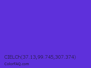 CIELCh 37.13,99.745,307.374 Color is a normal indigo color and the nearest color is Purple Heart Crayola #652dc1. Hex code #5e30db and RGB value is rgb(94,48,219). In RGB color space, this color is composed of 37% red, 19% green, 86% blue, In CMYK color space, this color is composed of 57% cyan, 78% magenta, 0% yellow , 14% black , In HSL color space, this color has a hue angle of 256° , 70% saturation and 52% lightness.