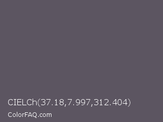 CIELCh 37.18,7.997,312.404 Color is a normal purple color and the nearest color is Scarpa Flow #585562. Hex code #5c5561 and RGB value is rgb(92,85,97). In RGB color space, this color is composed of 36% red, 33% green, 38% blue, In CMYK color space, this color is composed of 5% cyan, 12% magenta, 0% yellow , 62% black , In HSL color space, this color has a hue angle of 275° , 7% saturation and 36% lightness.