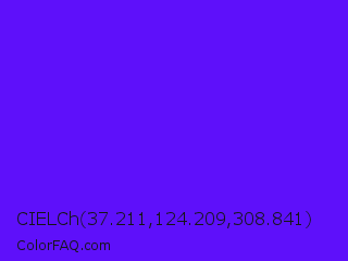 CIELCh 37.211,124.209,308.841 Color is a normal indigo color and the nearest color is Han Purple #5218fa. Hex code #5e10fa and RGB value is rgb(94,16,250). In RGB color space, this color is composed of 37% red, 6% green, 98% blue, In CMYK color space, this color is composed of 62% cyan, 94% magenta, 0% yellow , 2% black , In HSL color space, this color has a hue angle of 260° , 96% saturation and 52% lightness.