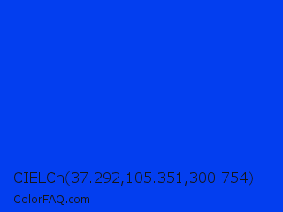 CIELCh 37.292,105.351,300.754 Color is a normal blue color and the nearest color is Blue RYB #0247fe. Hex code #033eef and RGB value is rgb(3,62,239). In RGB color space, this color is composed of 1% red, 24% green, 94% blue, In CMYK color space, this color is composed of 99% cyan, 74% magenta, 0% yellow , 6% black , In HSL color space, this color has a hue angle of 225° , 98% saturation and 47% lightness.