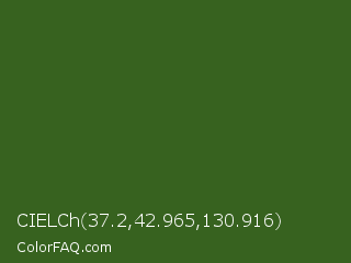 CIELCh 37.2,42.965,130.916 Color is a dark green color and the nearest color is Dell #396413. Hex code #37621f and RGB value is rgb(55,98,31). In RGB color space, this color is composed of 22% red, 38% green, 12% blue, In CMYK color space, this color is composed of 44% cyan, 0% magenta, 68% yellow , 62% black , In HSL color space, this color has a hue angle of 99° , 52% saturation and 25% lightness.