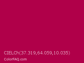 CIELCh 37.319,64.059,10.035 Color is a normal rose color and the nearest color is Pictorial Carmine #c30b4e. Hex code #b00049 and RGB value is rgb(176,0,73). In RGB color space, this color is composed of 69% red, 0% green, 29% blue, In CMYK color space, this color is composed of 0% cyan, 100% magenta, 59% yellow , 31% black , In HSL color space, this color has a hue angle of 335° , 100% saturation and 35% lightness.