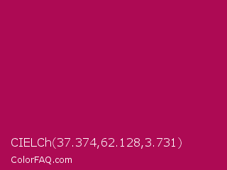 CIELCh 37.374,62.128,3.731 Color is a normal rose color and the nearest color is Jazzberry Jam #a50b5e. Hex code #ad0a54 and RGB value is rgb(173,10,84). In RGB color space, this color is composed of 68% red, 4% green, 33% blue, In CMYK color space, this color is composed of 0% cyan, 94% magenta, 51% yellow , 32% black , In HSL color space, this color has a hue angle of 333° , 89% saturation and 36% lightness.
