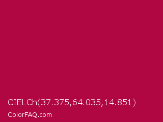 CIELCh 37.375,64.035,14.851 Color is a normal rose color and the nearest color is Shiraz #b20931. Hex code #b00641 and RGB value is rgb(176,6,65). In RGB color space, this color is composed of 69% red, 2% green, 25% blue, In CMYK color space, this color is composed of 0% cyan, 97% magenta, 63% yellow , 31% black , In HSL color space, this color has a hue angle of 339° , 93% saturation and 36% lightness.