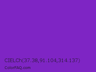 CIELCh 37.38,91.104,314.137 Color is a normal purple color and the nearest color is Purple Heart Crayola #652dc1. Hex code #7e25c4 and RGB value is rgb(126,37,196). In RGB color space, this color is composed of 49% red, 15% green, 77% blue, In CMYK color space, this color is composed of 36% cyan, 81% magenta, 0% yellow , 23% black , In HSL color space, this color has a hue angle of 274° , 68% saturation and 46% lightness.