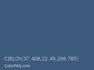 CIELCh 37.408,22.49,268.785 Color is a normal blue color and the nearest color is East Bay #414c7d. Hex code #3d5a7c and RGB value is rgb(61,90,124). In RGB color space, this color is composed of 24% red, 35% green, 49% blue, In CMYK color space, this color is composed of 51% cyan, 27% magenta, 0% yellow , 51% black , In HSL color space, this color has a hue angle of 212° , 34% saturation and 36% lightness.