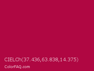 CIELCh 37.436,63.838,14.375 Color is a normal rose color and the nearest color is Shiraz #b20931. Hex code #b00742 and RGB value is rgb(176,7,66). In RGB color space, this color is composed of 69% red, 3% green, 26% blue, In CMYK color space, this color is composed of 0% cyan, 96% magenta, 63% yellow , 31% black , In HSL color space, this color has a hue angle of 339° , 92% saturation and 36% lightness.
