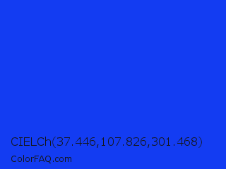 CIELCh 37.446,107.826,301.468 Color is a normal blue color and the nearest color is Blue RYB #0247fe. Hex code #133cf2 and RGB value is rgb(19,60,242). In RGB color space, this color is composed of 7% red, 24% green, 95% blue, In CMYK color space, this color is composed of 92% cyan, 75% magenta, 0% yellow , 5% black , In HSL color space, this color has a hue angle of 229° , 90% saturation and 51% lightness.