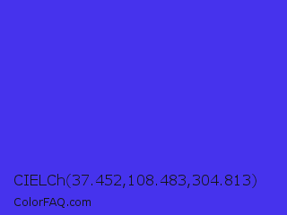 CIELCh 37.452,108.483,304.813 Color is a normal indigo color and the nearest color is Han Purple #5218fa. Hex code #4633ed and RGB value is rgb(70,51,237). In RGB color space, this color is composed of 27% red, 20% green, 93% blue, In CMYK color space, this color is composed of 70% cyan, 78% magenta, 0% yellow , 7% black , In HSL color space, this color has a hue angle of 246° , 84% saturation and 56% lightness.