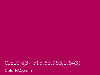 CIELCh 37.515,63.953,1.543 Color is a normal rose color and the nearest color is Lipstick #ab0563. Hex code #af0058 and RGB value is rgb(175,0,88). In RGB color space, this color is composed of 69% red, 0% green, 35% blue, In CMYK color space, this color is composed of 0% cyan, 100% magenta, 50% yellow , 31% black , In HSL color space, this color has a hue angle of 330° , 100% saturation and 34% lightness.