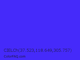 CIELCh 37.523,118.649,305.757 Color is a normal indigo color and the nearest color is Han Purple #5218fa. Hex code #452afa and RGB value is rgb(69,42,250). In RGB color space, this color is composed of 27% red, 16% green, 98% blue, In CMYK color space, this color is composed of 72% cyan, 83% magenta, 0% yellow , 2% black , In HSL color space, this color has a hue angle of 248° , 95% saturation and 57% lightness.