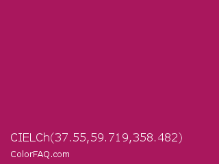 CIELCh 37.55,59.719,358.482 Color is a normal rose color and the nearest color is Jazzberry Jam #a50b5e. Hex code #a9175d and RGB value is rgb(169,23,93). In RGB color space, this color is composed of 66% red, 9% green, 36% blue, In CMYK color space, this color is composed of 0% cyan, 86% magenta, 45% yellow , 34% black , In HSL color space, this color has a hue angle of 331° , 76% saturation and 38% lightness.