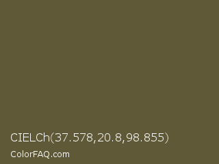 CIELCh 37.578,20.8,98.855 Color is a dark yellow color and the nearest color is Verdigris #5d5e37. Hex code #5f5937 and RGB value is rgb(95,89,55). In RGB color space, this color is composed of 37% red, 35% green, 22% blue, In CMYK color space, this color is composed of 0% cyan, 6% magenta, 42% yellow , 63% black , In HSL color space, this color has a hue angle of 51° , 27% saturation and 29% lightness.