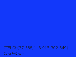 CIELCh 37.588,113.915,302.349 Color is a normal blue color and the nearest color is Blue RYB #0247fe. Hex code #1238fa and RGB value is rgb(18,56,250). In RGB color space, this color is composed of 7% red, 22% green, 98% blue, In CMYK color space, this color is composed of 93% cyan, 78% magenta, 0% yellow , 2% black , In HSL color space, this color has a hue angle of 230° , 96% saturation and 53% lightness.