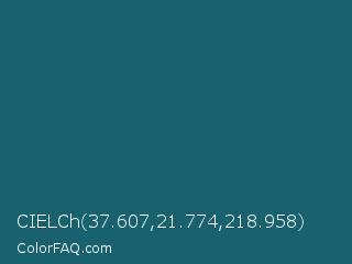 CIELCh 37.607,21.774,218.958 Color is a dark cyan color and the nearest color is Blumine #18587a. Hex code #18616e and RGB value is rgb(24,97,110). In RGB color space, this color is composed of 9% red, 38% green, 43% blue, In CMYK color space, this color is composed of 78% cyan, 12% magenta, 0% yellow , 57% black , In HSL color space, this color has a hue angle of 189° , 64% saturation and 26% lightness.