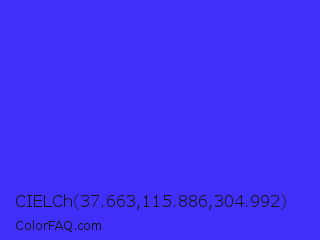 CIELCh 37.663,115.886,304.992 Color is a normal indigo color and the nearest color is Han Purple #5218fa. Hex code #402ff8 and RGB value is rgb(64,47,248). In RGB color space, this color is composed of 25% red, 18% green, 97% blue, In CMYK color space, this color is composed of 74% cyan, 81% magenta, 0% yellow , 3% black , In HSL color space, this color has a hue angle of 245° , 93% saturation and 58% lightness.