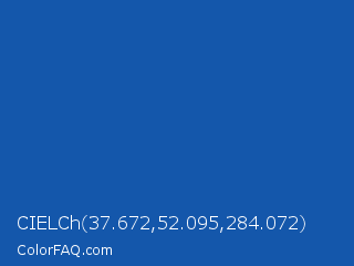 CIELCh 37.672,52.095,284.072 Color is a normal blue color and the nearest color is Fun Blue #1959a8. Hex code #1457ab and RGB value is rgb(20,87,171). In RGB color space, this color is composed of 8% red, 34% green, 67% blue, In CMYK color space, this color is composed of 88% cyan, 49% magenta, 0% yellow , 33% black , In HSL color space, this color has a hue angle of 213° , 79% saturation and 37% lightness.